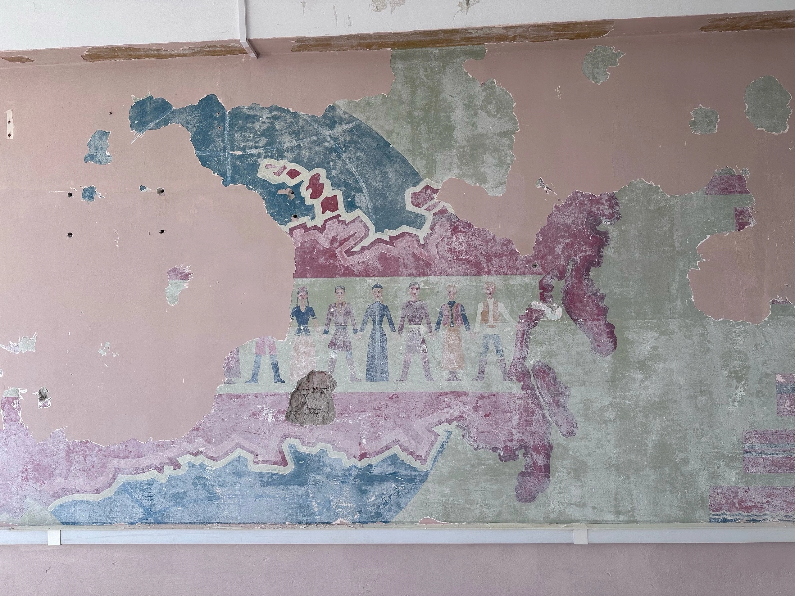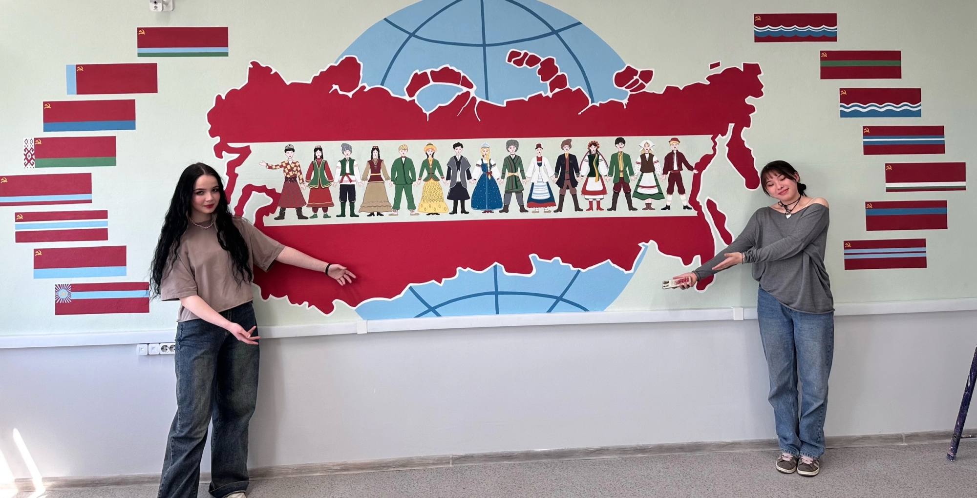 Под слоем штукатурки в одном из кабинетов Многоуровневого колледжа в Улан-Удэ во время ремонта проявилась фреска, контур Советского союза с представителями 15-ти республик и флагами.