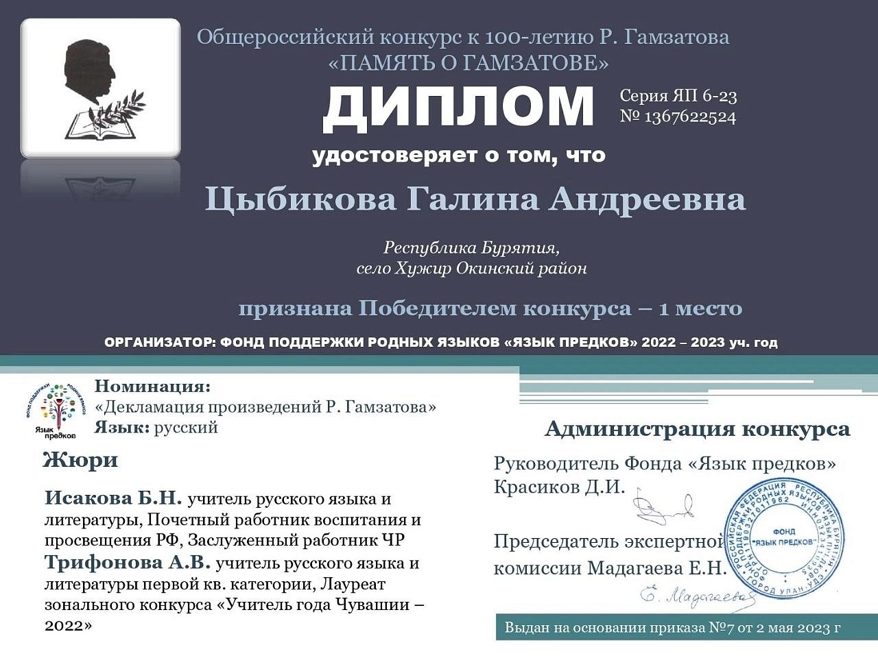 Мастерское исполнение стихотворения попало в номинацию «Декламация стихотворений Р. Гамзатова на родном или русском языке по выбору участника». Жюри, в состав которого входили руководитель Фонда поддержки родных языков, привлеченные педагоги, ученые, методисты по регионам оценили декламацию Галины Цыбиковой и присудили ей I место.